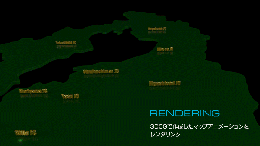 またクライアント様のご希望により、滋賀県各地の青年会議所様の位置と、それらが開催地の栗東へと集合するイメージを、3DCGにて制作させていただきました。空中を流れるようなカメラワークと、スピード感や上昇感を感じられる映像とすることで、若者らしい行動力を表現させていただきました。